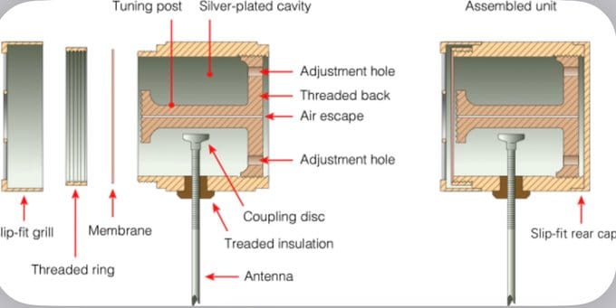 The device was ingeniously simple yet decades ahead of its time. Inside the wooden plaque sat a small silver-plated copper cylinder — roughly 24 mm in diameter, 19 mm long — forming a high-Q resonant cavity. A thin 75-micrometer conductive membrane sealed one end. A quarter-wave monopole antenna (about 23 cm long) protruded, capacitively coupled to a central mushroom-shaped tuning post.